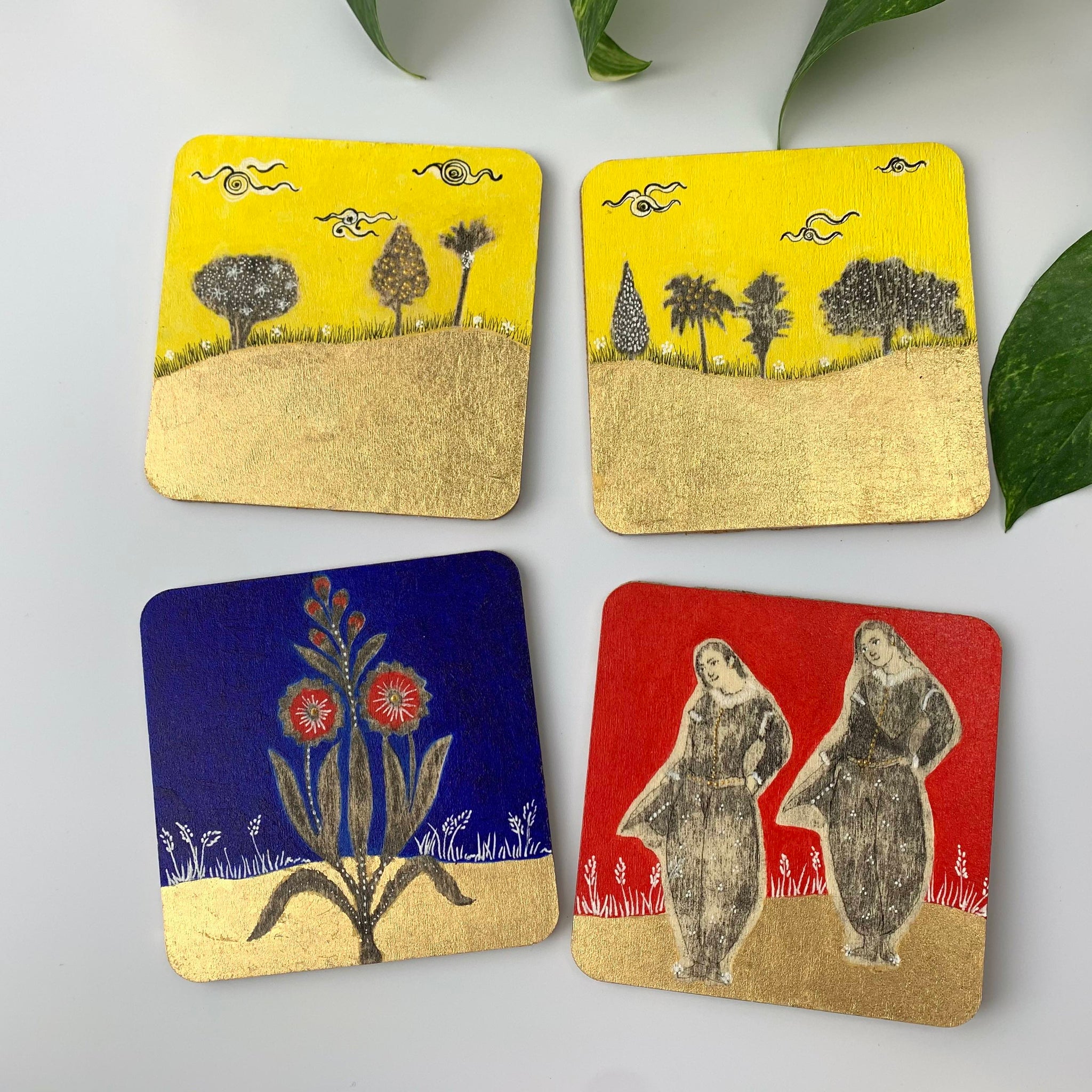 These one-of-a-kind, hand-painted coasters come as a set of four, crafted and painted on high-quality, wear-resistant engineered wood by artist Sumaira Tazeen. They capture the charm of Mughal miniature painting in a...